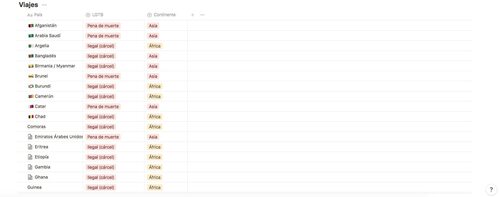 Siguiendo este ejemplo, puedes añadir varias vistas distintas según qué países no has visitado aún, una general o una de los que has descartado. En cada vista puedes filtrar qué categorías quieres ver y filtrar la información según lo que hayas escrito en las categorías, las cuales explicaremos un poco más abajo.